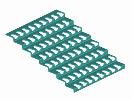 階梯篩板結(jié)構(gòu)特點(diǎn): 階梯篩板的篩框采用輕鋼骨架,篩面采用優(yōu)質(zhì)鋼板,通過(guò)沖壓、折彎等多道工序加工而成。階梯篩板不但有較好的耐磨性和較高的韌性,其突出的優(yōu)點(diǎn)是其篩孔為非平面篩孔,經(jīng)過(guò)特殊設(shè)計(jì)的篩孔可以完全消除物料堵孔現(xiàn)象,生產(chǎn)效率高,分級(jí)效果好,具有廣泛的實(shí)用性。采用階梯篩板,可大大降低每個(gè)工作日后的振動(dòng)篩面清理工作量。 主要適用于原煤分級(jí)(25mm以上)。