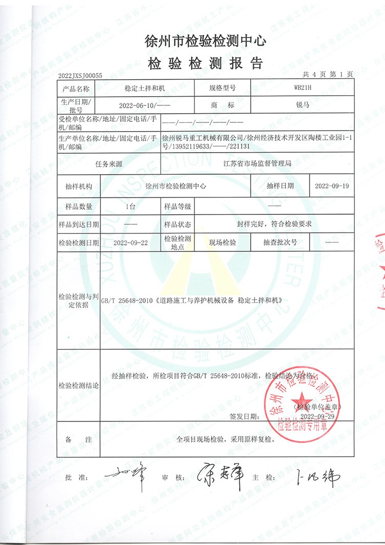 受江蘇省市場監(jiān)督管理局委托,徐州市檢驗(yàn)檢測中心近期對我公司產(chǎn)品穩(wěn)定土拌和機(jī)做了整機(jī)檢測。